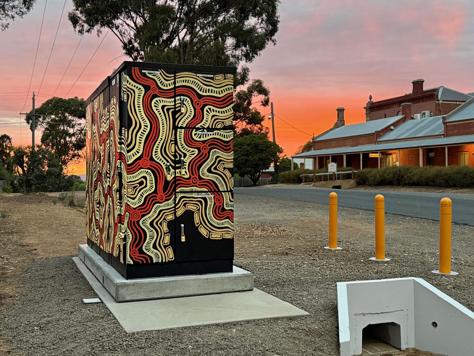The centre of the artwork depicts life within community, people sharing the township and surrounds, and how one flows to the next. The line-work is Maldon people, the community itself, standing together alongside one another. The inner layer of the artwork with blocks reflects structure, understand that this is a shared space and there are many old and existing stories within the landscape, seen through structures build, spaces shared, and stories told about today from many years ago.